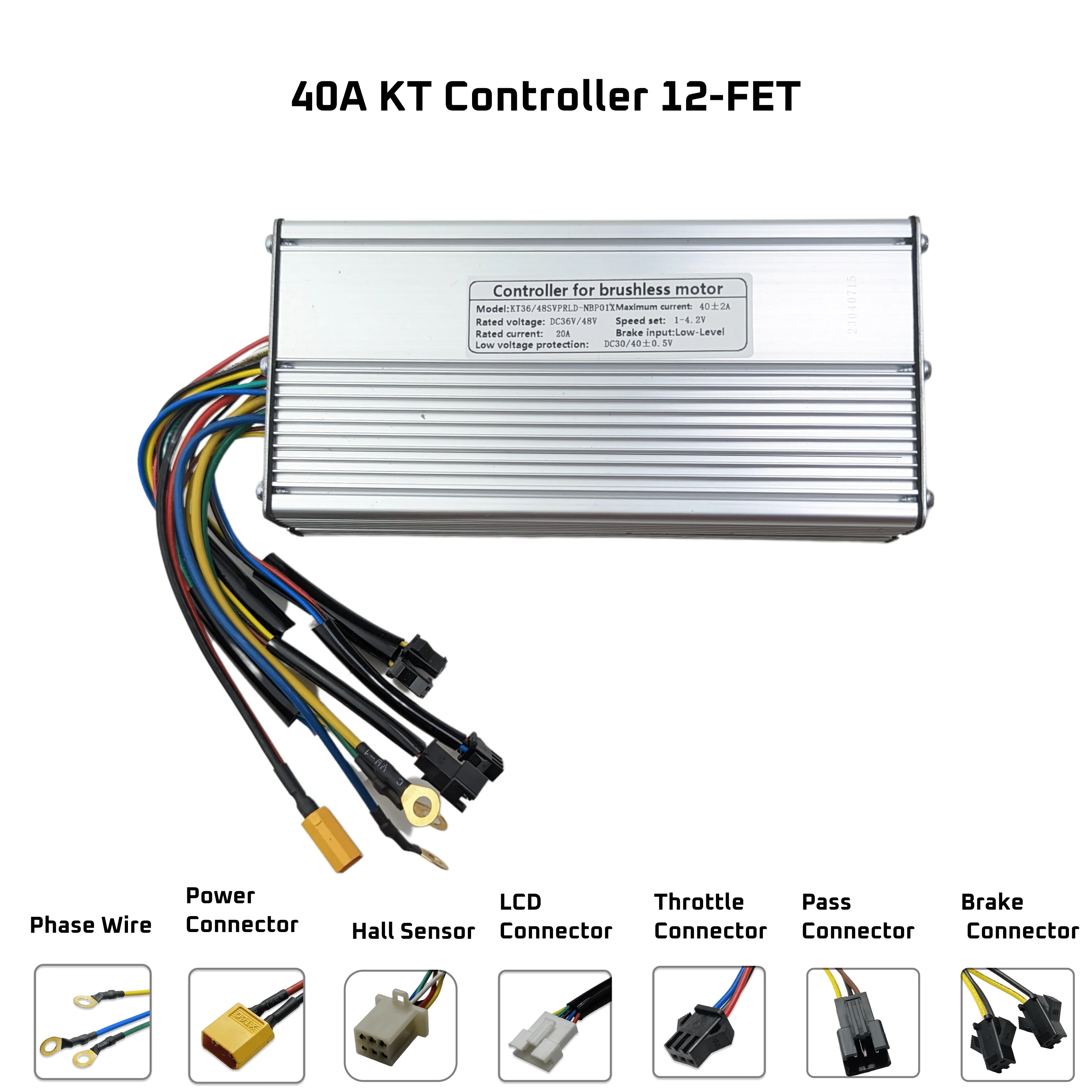 - Sine Wave Controller (more stable, high efficiency, low current consumption, long life)Support KT LED Control Panel or KT LCD Control Panel or without any Control Panel (Universal)Support 48V Light Control Rated current: 20+-2A Maximum Current: 40A